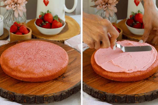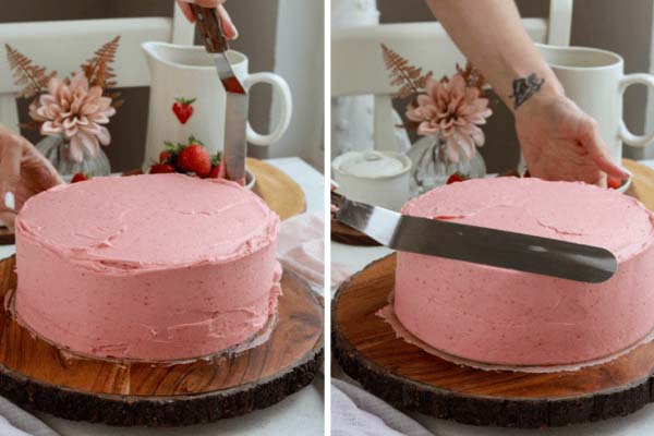در هشتمین مرحله از طرز تهیه کیک توت فرنگی با کمک یک چاقوی تیز و دندانهدار، یک لایه نازک از روی کیکها را برش داده و صاف کنید. یک لایه از کیک را روی صفحه کیک یا سطح کارتان بگذارید. روی آن را کامل فراستینگ پخش کنید. لایه دوم را هم گذاشته و مجدد فراستینگ را روی آن پخش کنید. دقت داشته باشید که فراستینگ، سطح و کنارههای کیک توت فرنگیتان را کامل بگیرد. در نهایت کیک را حداکثر ۲۴ ساعت یا حداقل ۴۵ دقیقه داخل یخچال بگذارید تا شکل خود را خوب حفظ کند.