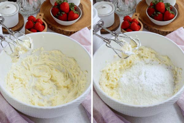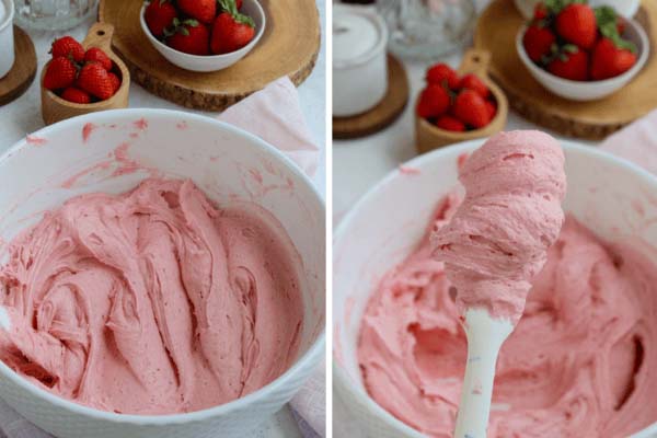در چهارمین مرحله از طرز تهیه کیک توت فرنگی باید کره را به همراه شکر به مدت ۲ دقیقه با سرعت بالا هم بزنید. کره و شکر را تا جایی باید بزنید که کرمرنگ و یکدست شود. حال سفیدههای تخممرغ را با سرعت بالا برای ۲ دقیقه با مخلوط شکر و کره هم بزنید تا از لختگی درآمده و مخلوط شوند. ماست و وانیل را هم اضافه کنید و ۲ دقیقه دیگر با سرعت هم بزنید. برای تولدهایتان میتوانید طرز تهیه کیک تولد توت فرنگی را خوانده و درست کنید.